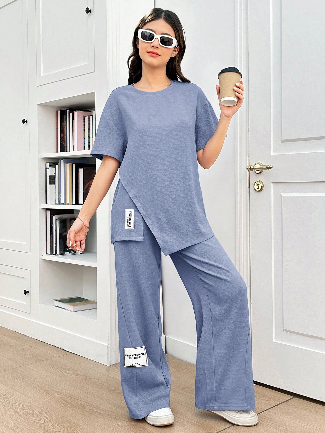 بدلة رياضية وعصرية للفتيات المراهقات، تتكون من قميص بأكمام قصيرة ذو رقبة دائرية وأذيال غير متماثلة،