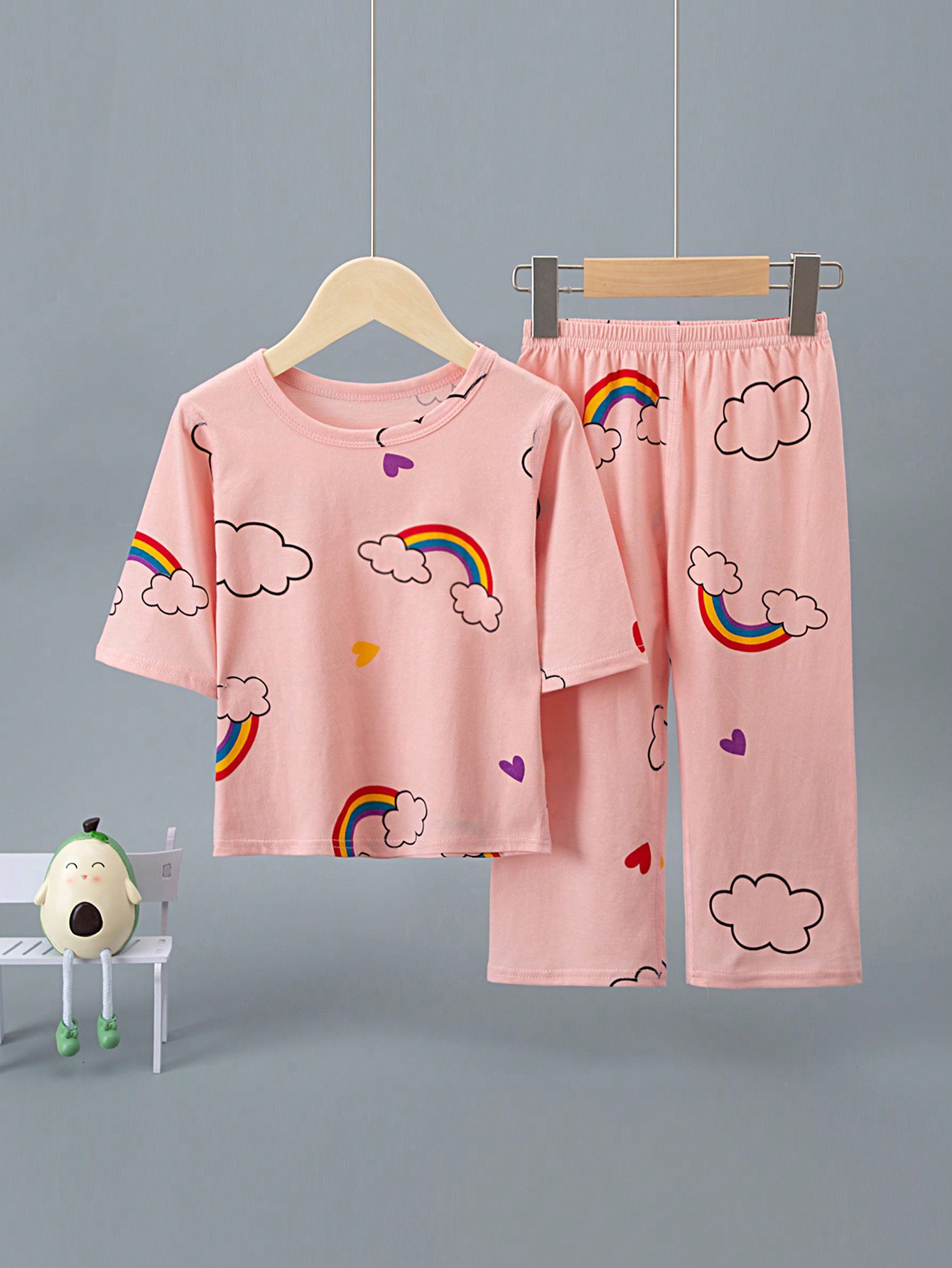 بذلة بيجاما للبنات الصغيرات بطبعة الغيوم والقوس الكرتونية ، بنطلون صيفي خفيف الوزن وعديم الراسات بأ