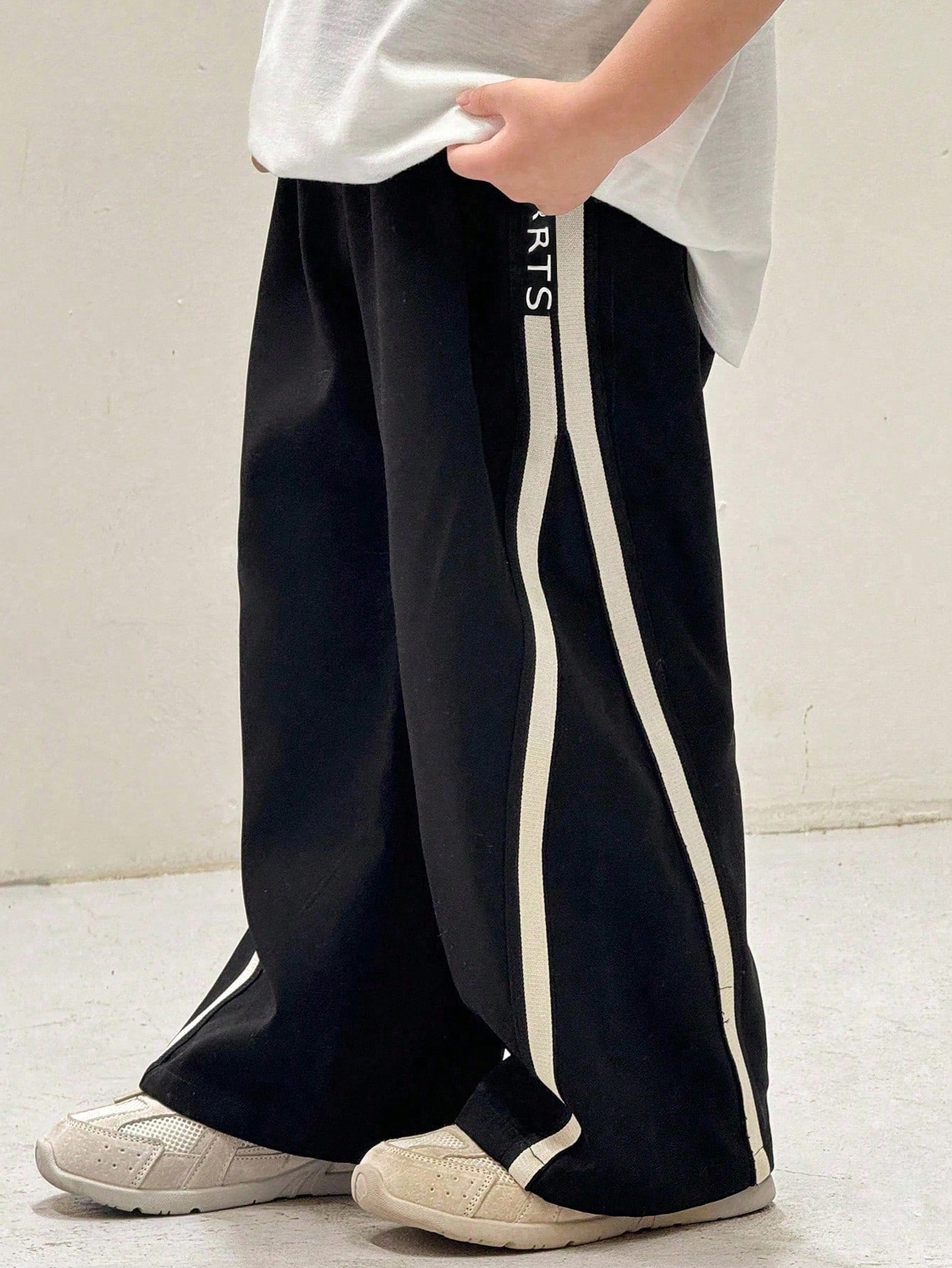 بناطيل رجالية واسعة بخصر متدلي للأولاد ذوي السن المراهق، باللون الأسود، مطبوع عليها شريط جانبي وطباع
