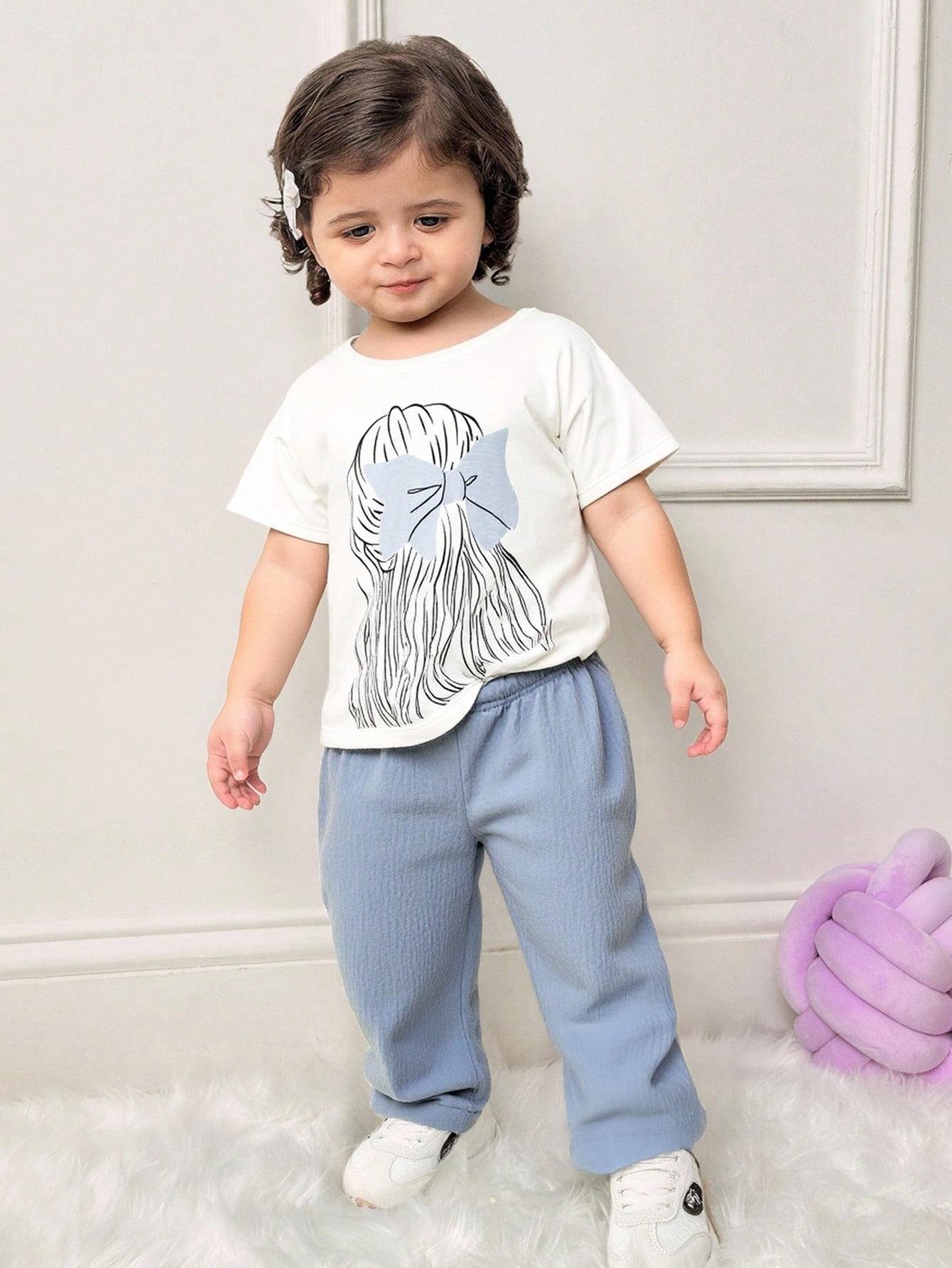 حزمة بنطلون وتي شيرت مطبوع بشخصيات كرتونية 2 قطعة للأطفال البنات، ملابس كاجوال