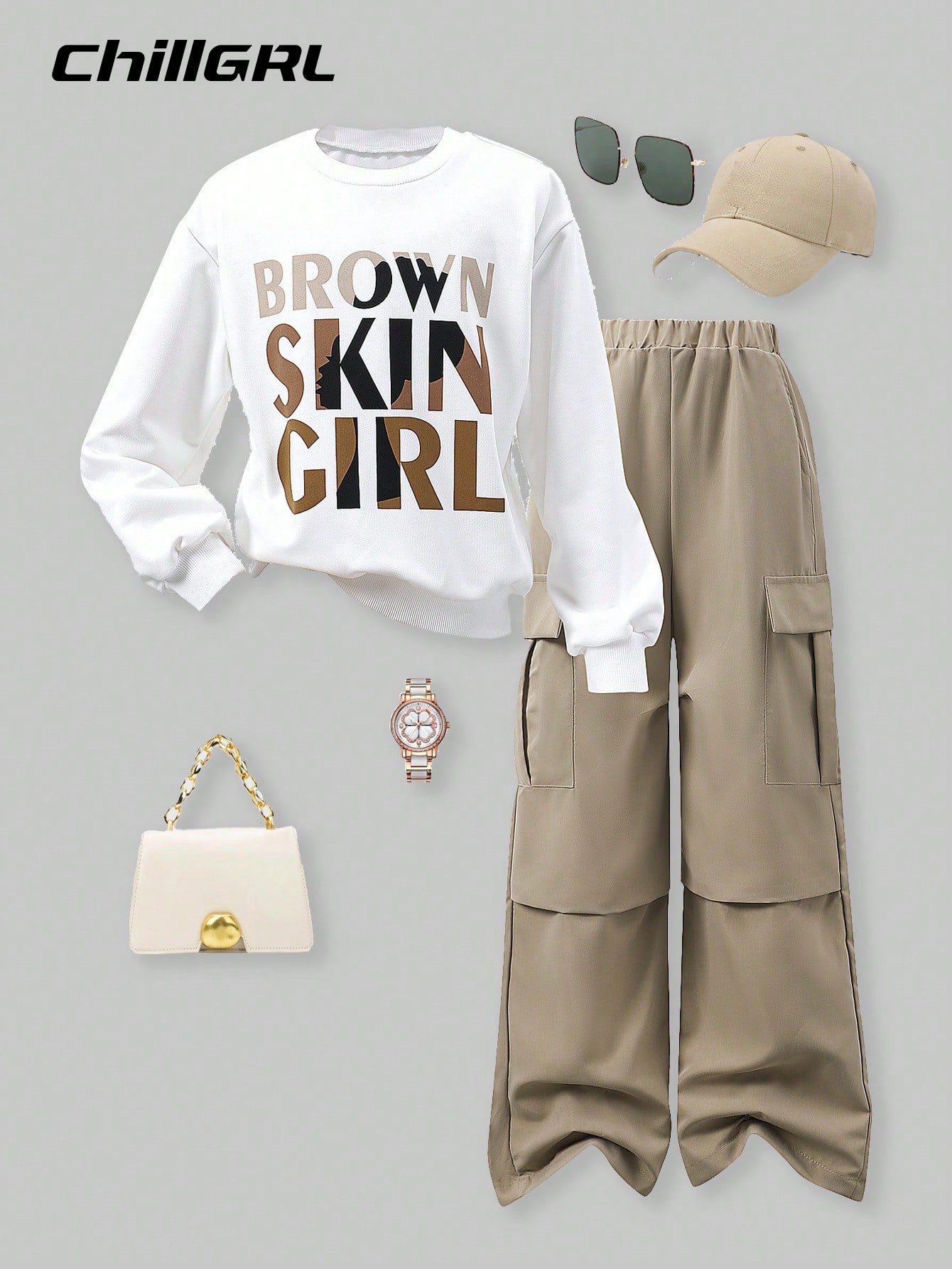 طقم بنطال شحن أبيض مطبوع عليه أحرف وبنطال صياد حمل كاكي لفتاة المراهقة, ملابس كاجوال وأزياء شارع عصر