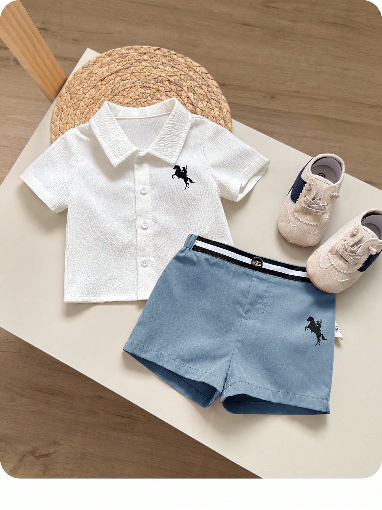 طقم قميص أبيض بأكمام قصيرة مع شورت خصر مطاطي وحزام خاكي للأطفال الرضع البنات/الأولاد، مريح وعملي للص