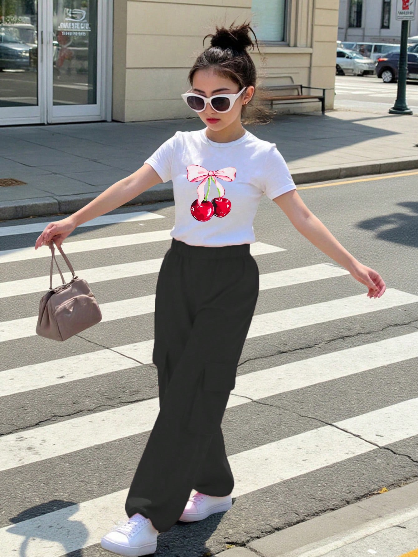 طقم ملابس علوية بياقة طاقم أكمام قصيرة مع طباعة الكرز وبناطيل الحمولة بطراز رياضي بسيط باللونين الأح