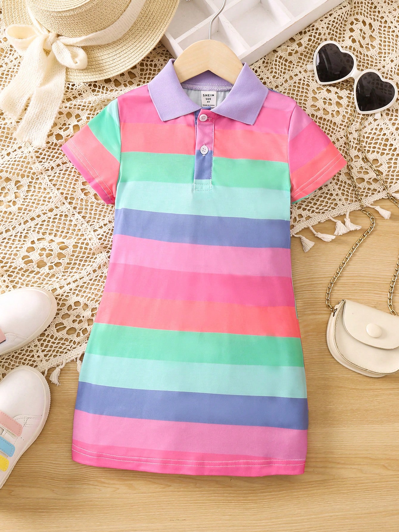 فستان ألوان متجانسة أنيق نمط الكلية أسلوب أساسي بعنق بولو اكمام عادية للصيف بنت طفل