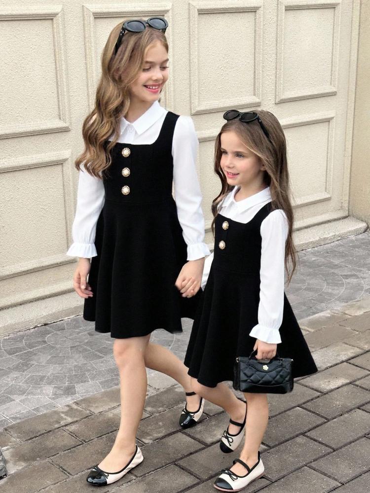 فستان أنيق للفتاة الصغيرة بلون أسود وأبيض مطابق، ذو أكمام فانوس وتصميم قابل للتحويل، فستان خريفي، عو