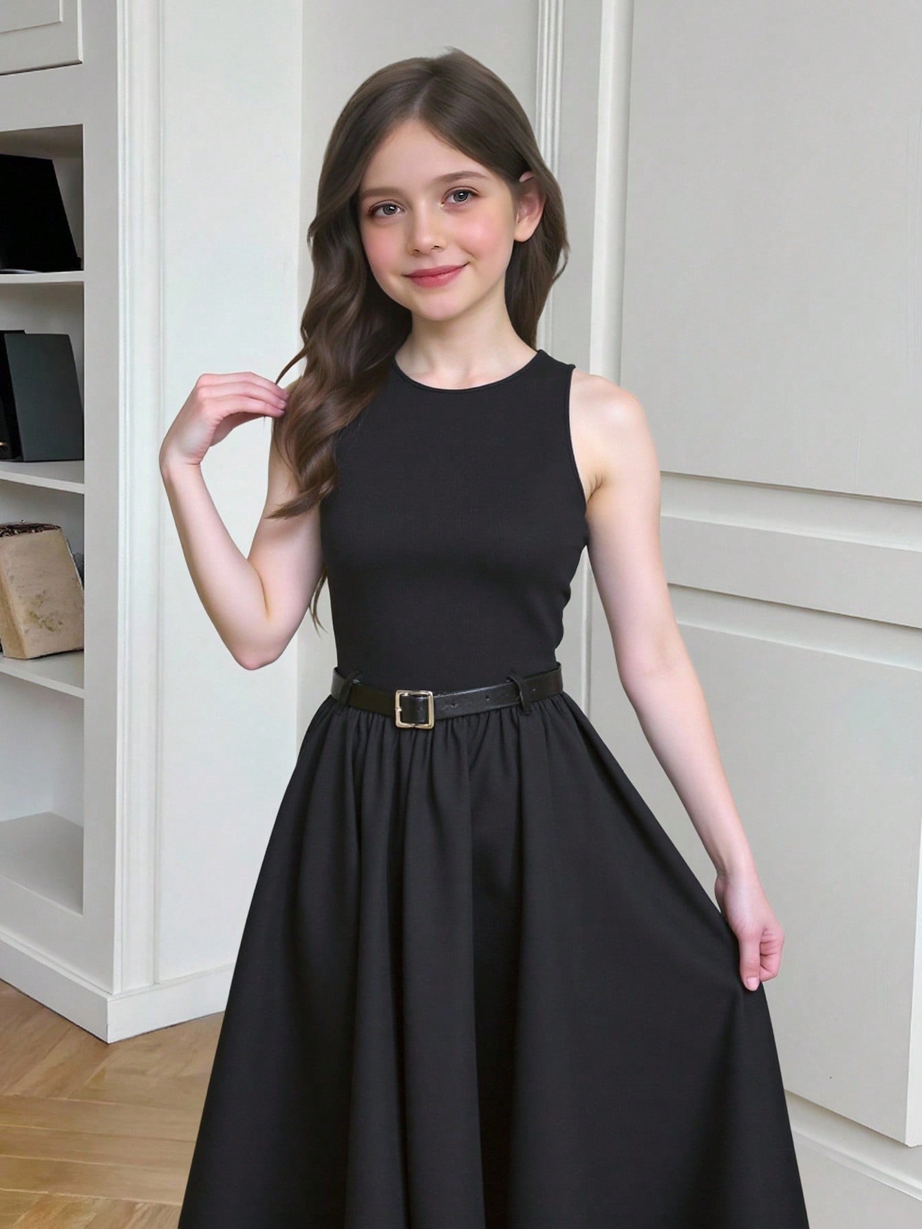 فستان بناتي مراهق أنيق ذو طراز قديم، قطعة واحدة بياقة طاقم وأكمام طويلة منسوجة بنسيج مرتبط بحزام من
