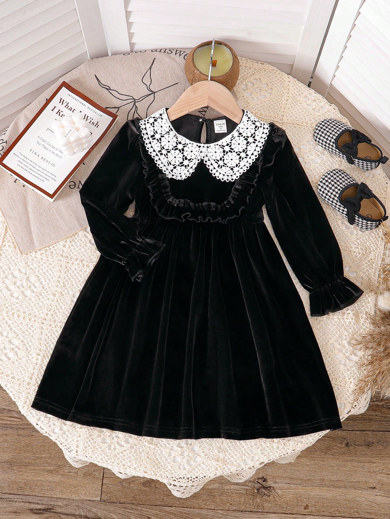 فستان طويل أنيق من الدانتيل الأسود بأكمام طويلة وذيل مكسّر للفتاة الشابة ، موسم الخريف والشتاء قطعة