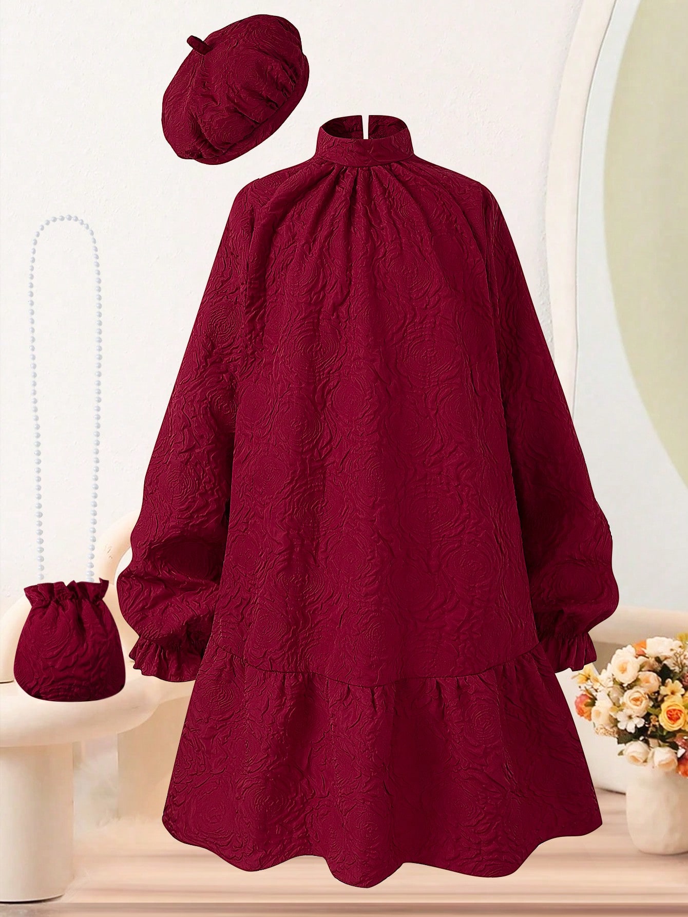 فستان طويل الأكمام بلون أنيق مقصوص للبنات المراهقات مع قبعة وحقيبة، مناسب للخريف والشتاء