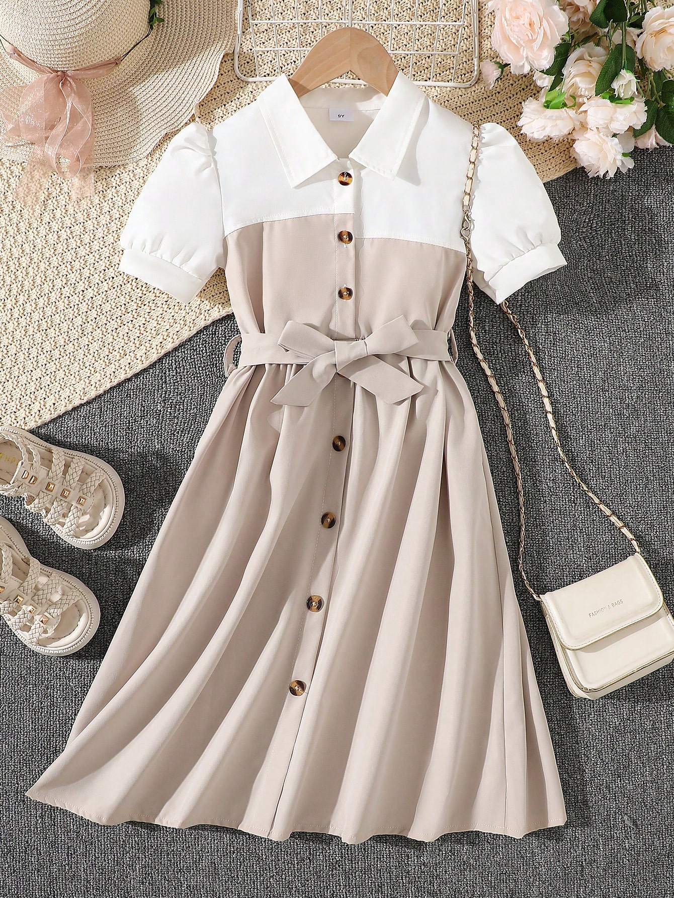 فستان كاجوال فاشن للبنات من عمر 8-12 سنة، فستان فستان لون متباين للرقبة والتصميع، بأسلوب أنيق، مناسب
