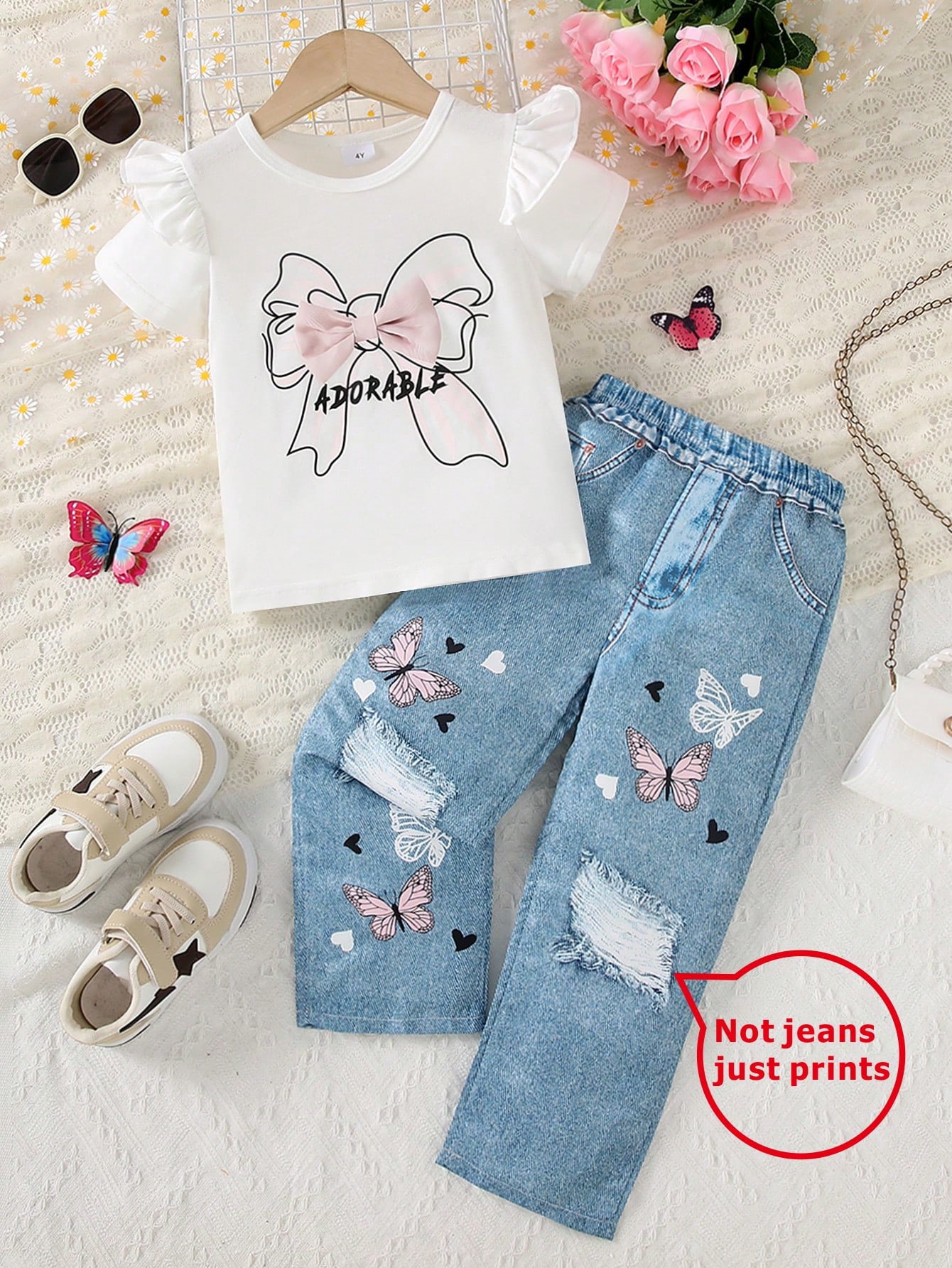 قميص كاجوال صيفي للفتيات مع طباعة الفيونكة + بنطلون بطباعة جينز مزيف