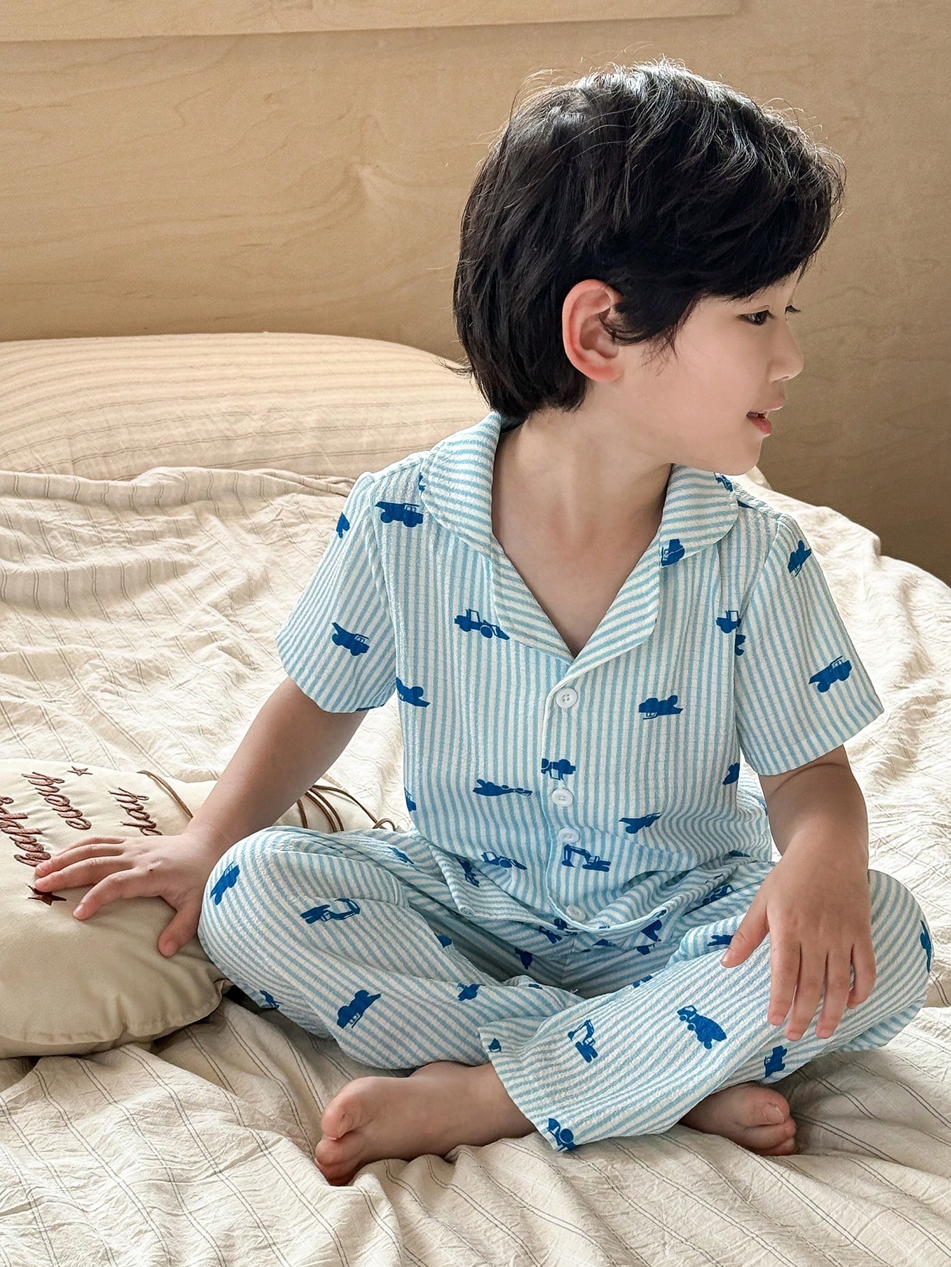 مجموعة بيجاما للأولاد بطبعة السيارات، قميص كم قصير ومواصفات القماش مصنوعة نسيجية وشورت ، ملابس منزلي