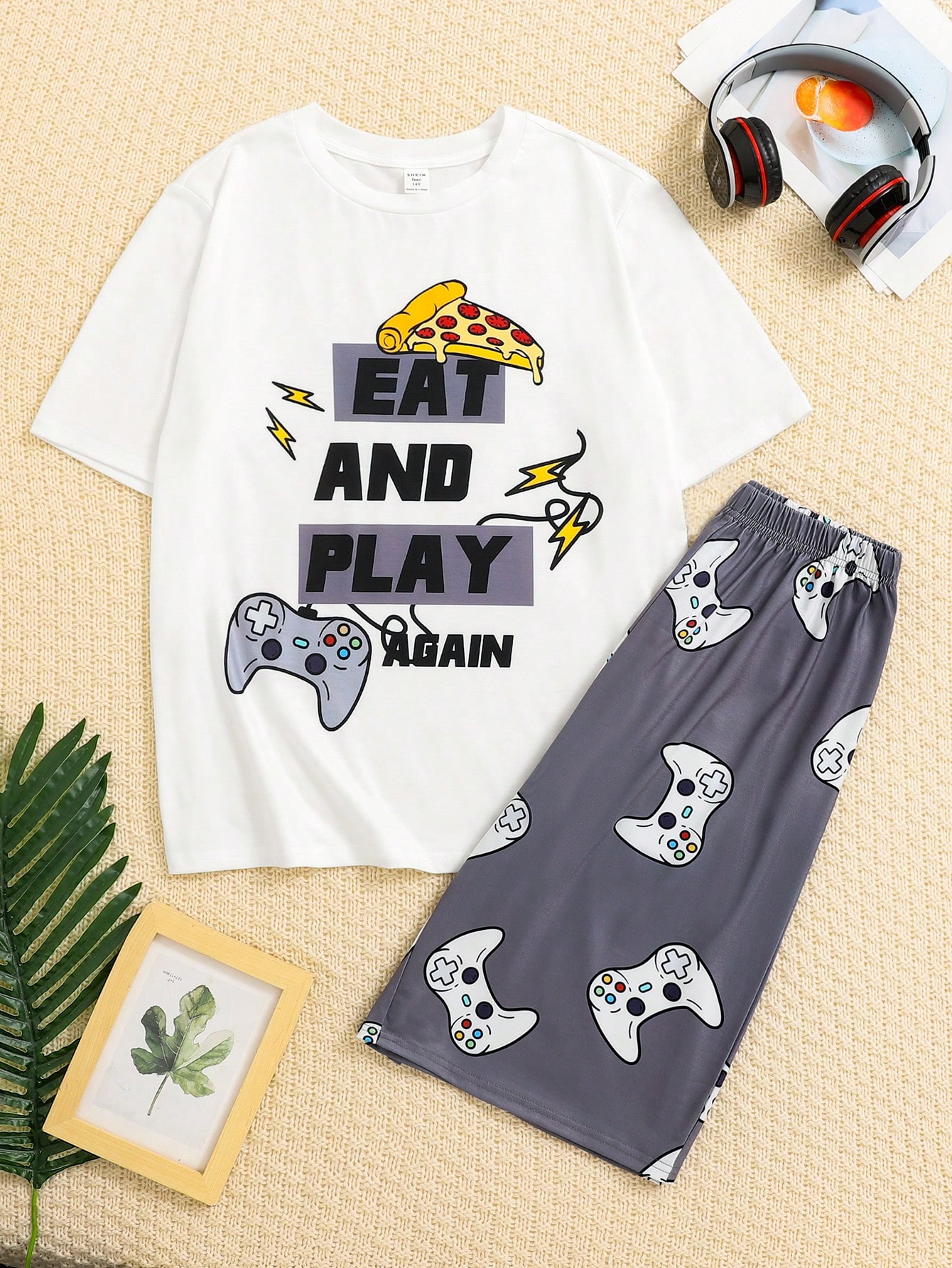 مجموعة/ طقم بنطلون قصير وتيشيرت بأكمام قصيرة لفتى مراهق بطباعة حرف ولوحة ألعاب، بياقة مستديرة، بدلة