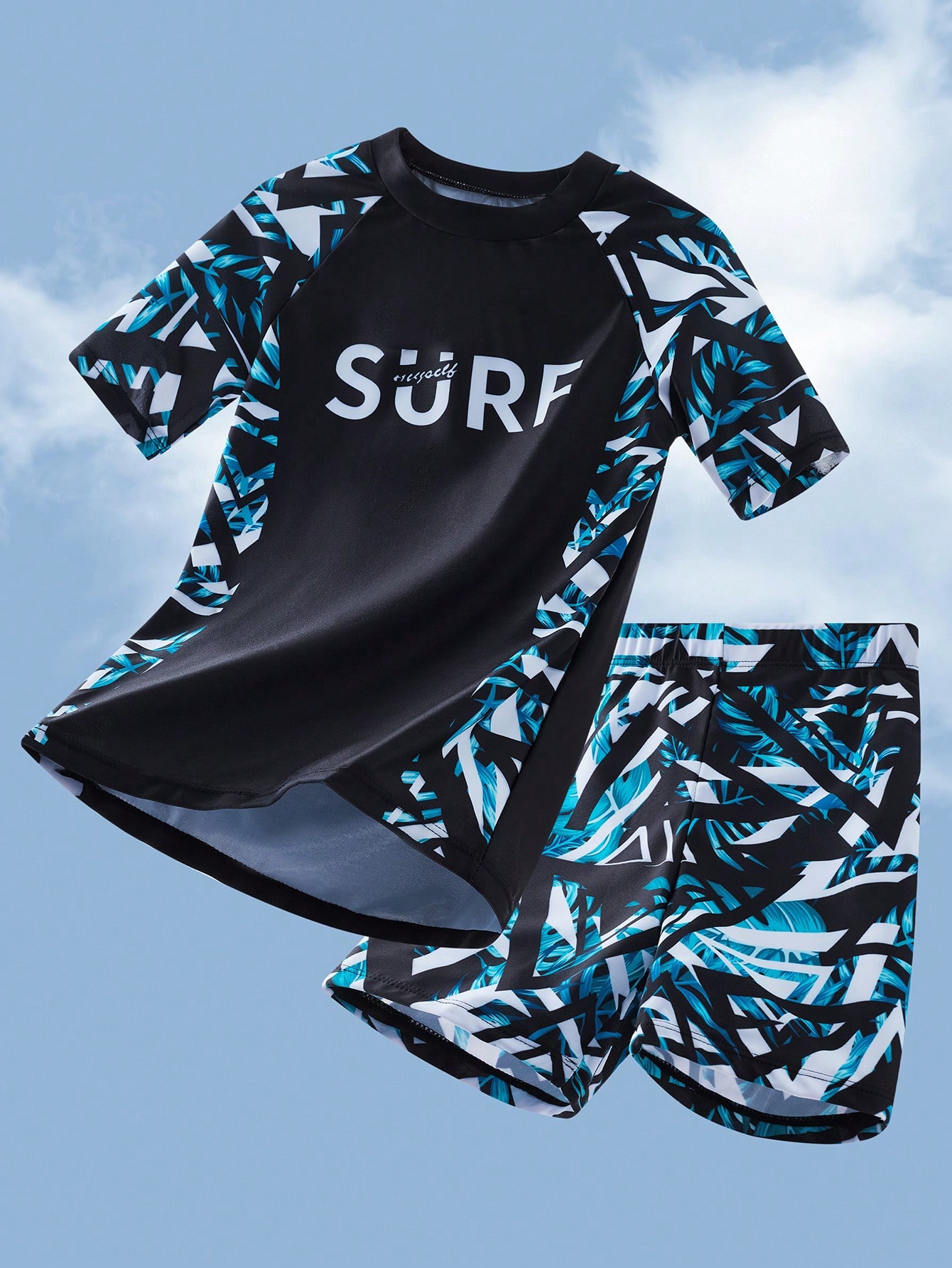 مجموعة لباس السباحة لصبية المراهقين 2 قطعة من الملابس المرنة اليومية ذات طباعة بني وأبيض، تشمل بلوزة