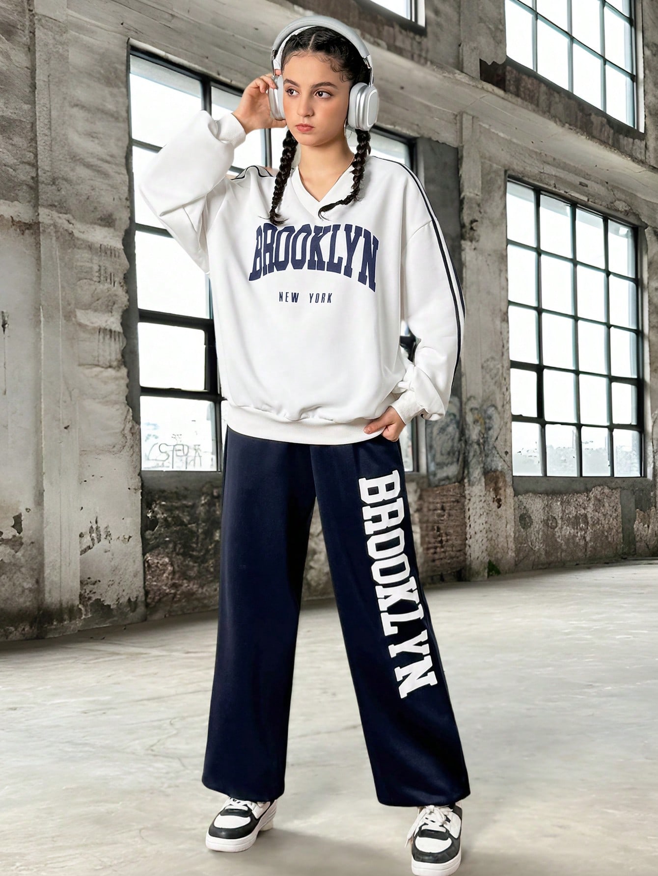 مجموعة متناسقة من 2 قطعة للبنات المراهقات تناسب العودة للمدرسة، عنق على شكل حرف V، مطبوع بأرقام وحرو