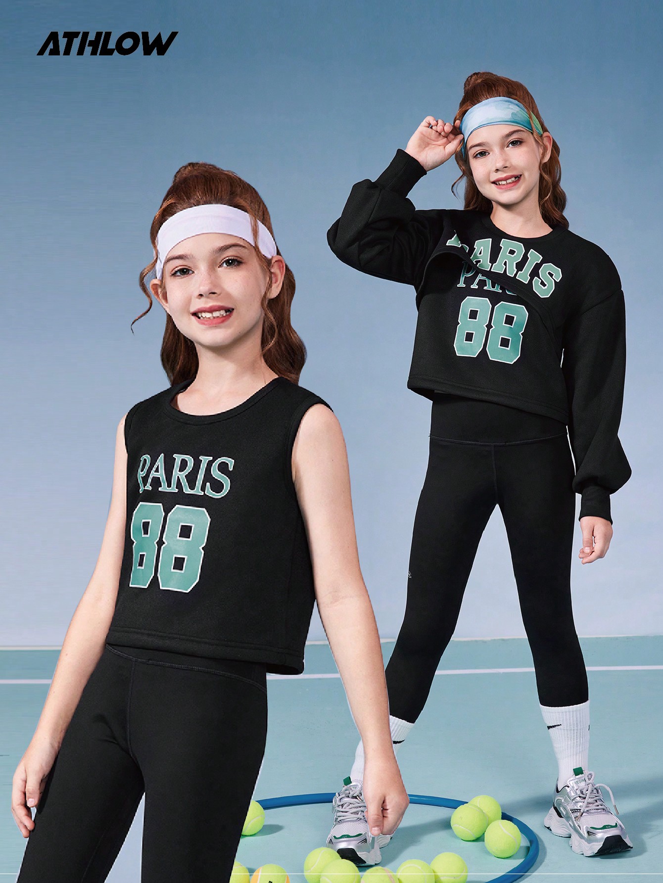 مجموعة من قطعتين للبنات المراهقات سترة رياضية بطبعات إنجليزية وقمصان بأكمام طويلة وعنق طاقم، وسترة ع