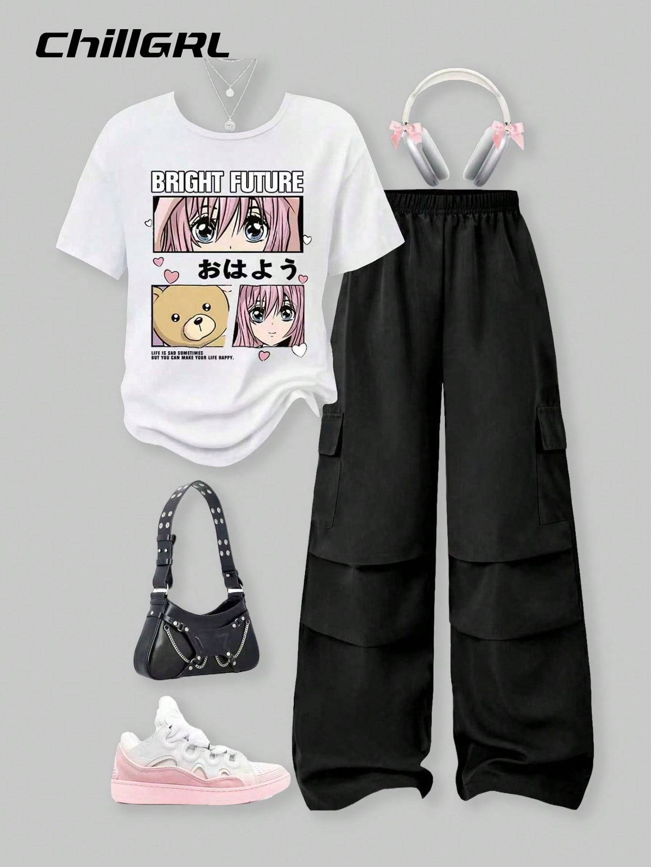 مجموعة من قطعتين ملابس علوية نصف كم ذات طباعة فتاة كاريكتورية وبنطلون كارجو وردي, ملابس كاجوال