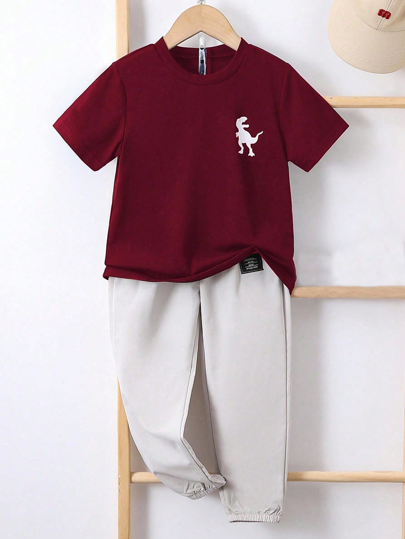 مجموعة من قميص كم قصير رقبة دائرية مطبوع بديناصور كرتوني وبنطلون رمادي فاتح كاجوال لأطفال الحضانة ،