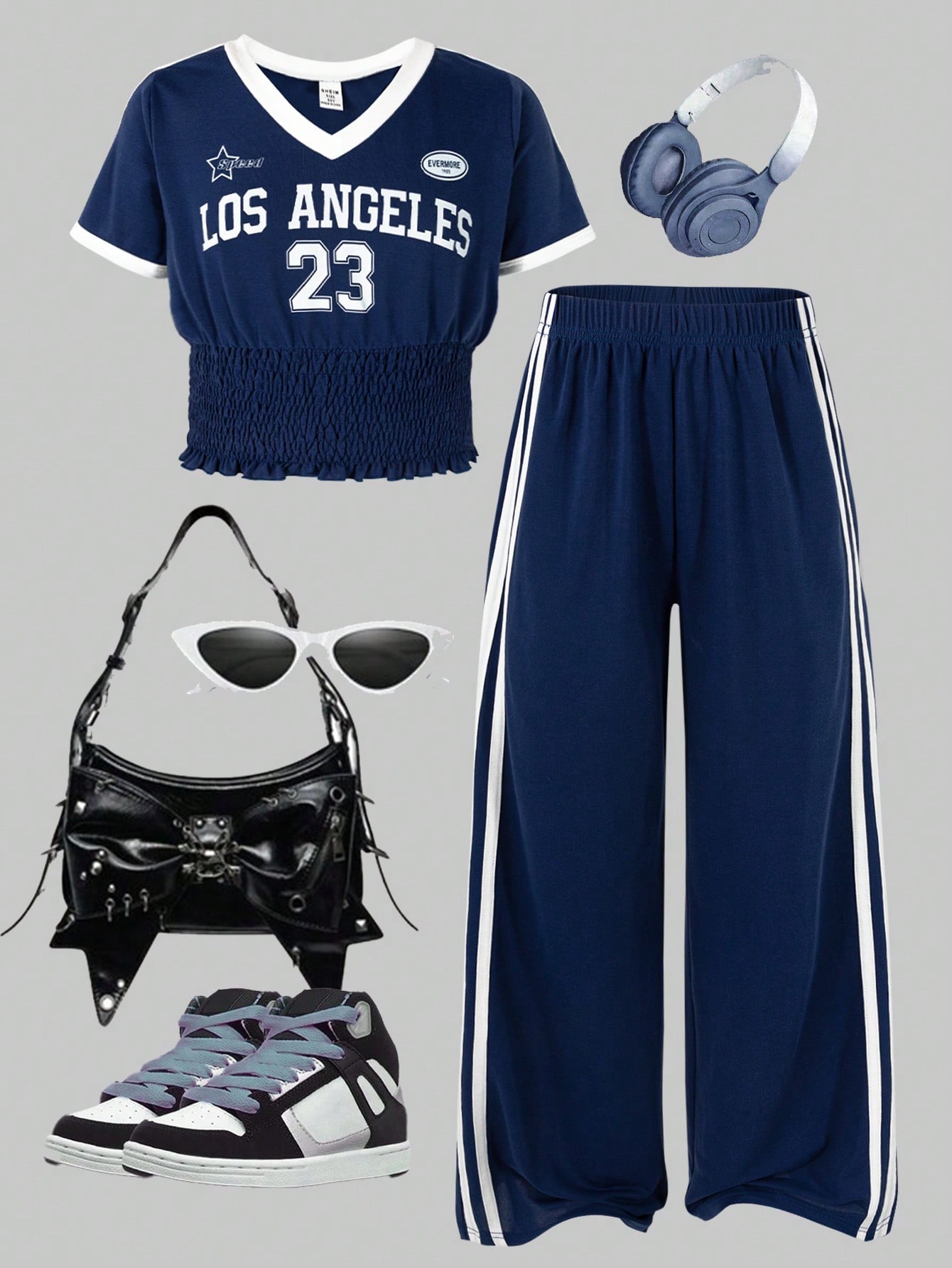 مجموعة 2 قطعة للفتيات المراهقات بقميص كرة قاعدة مطبوع عليه حرف وبنطال فضفاض مخطط للا