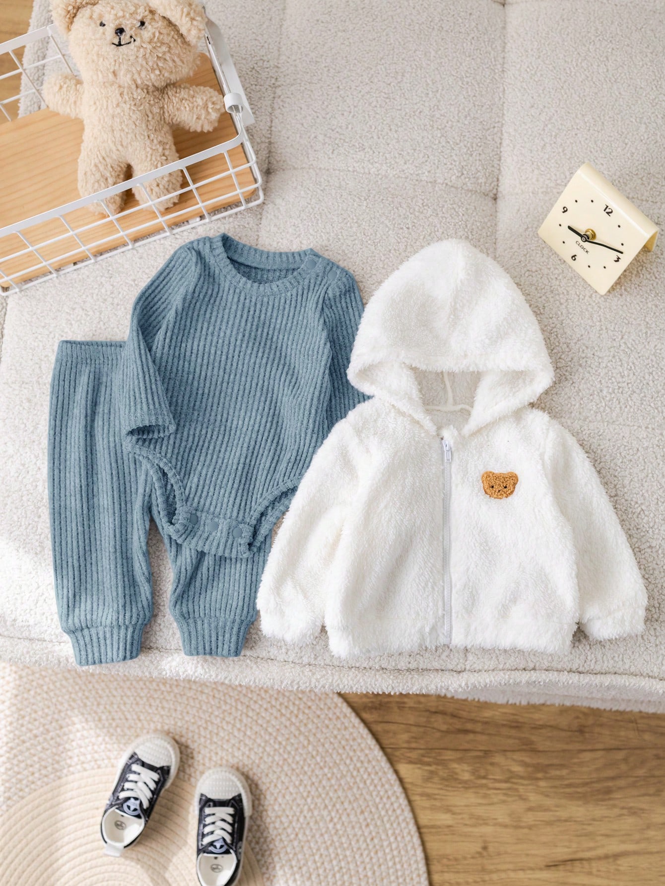 مجموعة 3 قطع لحديثي الولادة بنات و أولاد - معطف مطبّع بدبّ لطيف مع قبّعة ، بيكيني وبنطلون ملائمة للخ