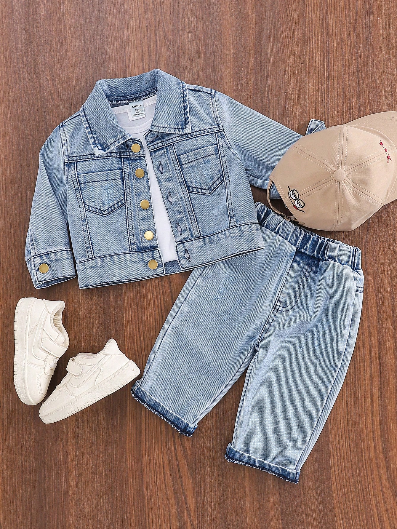 2 قطعة/طقم ملابس أطفال صبيان كاجوال من الدنيم الأسود البلي ذو الياقة، وبنطلون جينز باهت، طقم أنيق وم