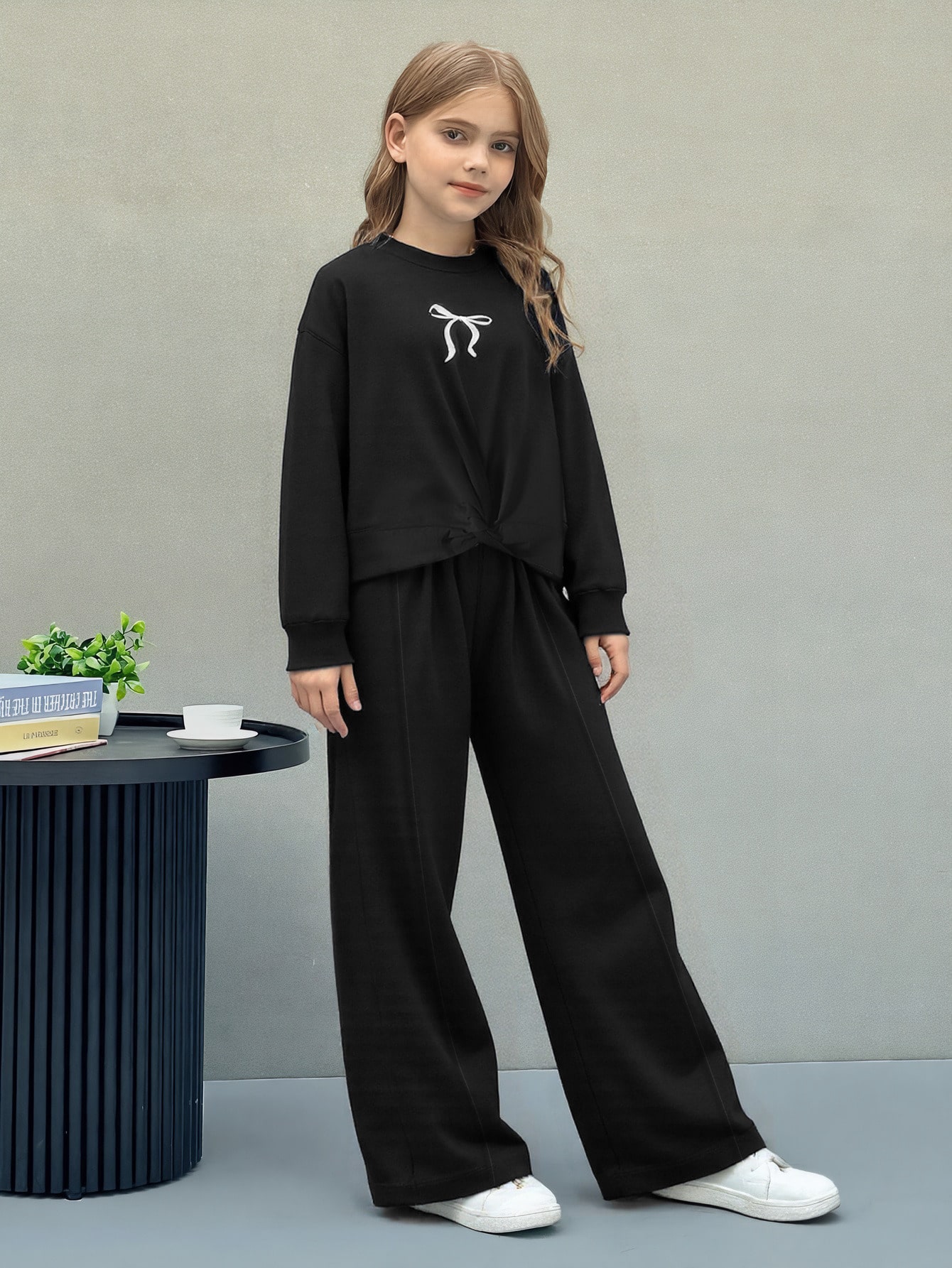 Purechapter طقم فتاة التين بلوزة رياضية وبنطال رياضي برقبة دائرية وبطبعة فراشة الشريط الطويلة الأكما