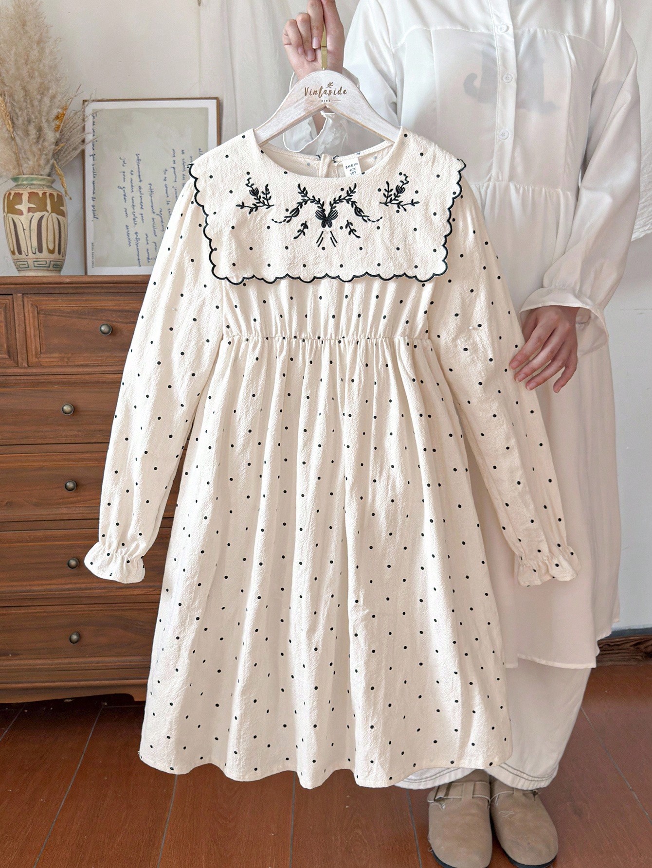 Vintaside Kids فستان فضفاض بياقة دائرية مطبوع بنقاط بولكا وتطريز زهري، خريفي